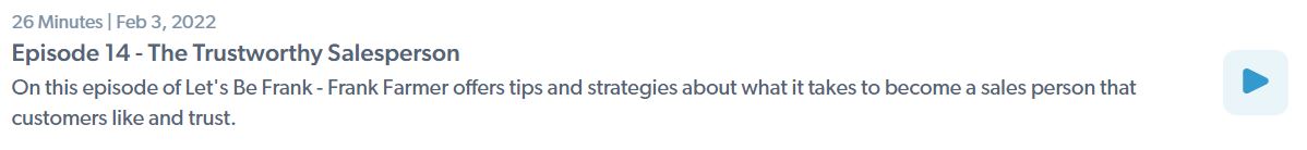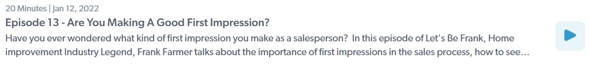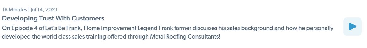 Let's Be Frank features Home Improvement Legend Frank Farmer of American Metal Roofs and Jim Anderson of Alfred Anderson Marketing. Frank and Jim share their years of experience in home improvement sales and marketing in topical conversation. Let's Be Frank is for roofers and other home improvement professionals seeking to improve their sales processes and grow their business.