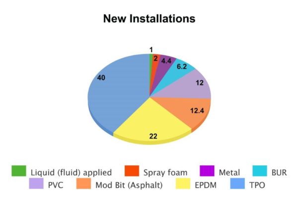 The 2015-2016 NRCA Market Survey http://www.nrca.net/2016-market-survey shows that roof system types throughout the U.S. continue to reflect the recent trends in low slope commercial roofing applications. The survey results show TPO as the low-slope market leader, garnering a 40 percent share of the new construction market and 30 percent of the reroofing market. EPDM follows next, capturing 22 percent of market share for new construction and 26 percent of the reroofing market. In third place is Mod Bit at 12.4 percent of the new construction market and 14 percent of the reroofing market. Market share for these and other system solutions follow by percentage in the chart below: