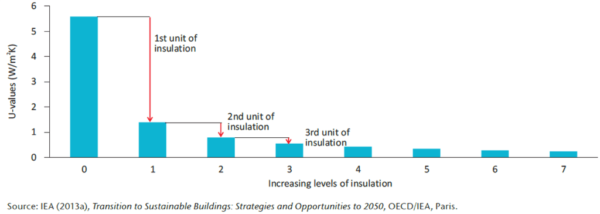 As more insulation is piled up in an attempt to further improve building energy efficiency, the reduction in heat flow (U-value) diminishes with each successive layer. The cost/benefit of more insulation eventually becomes prohibitive. See the chart below.