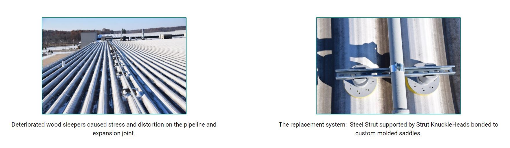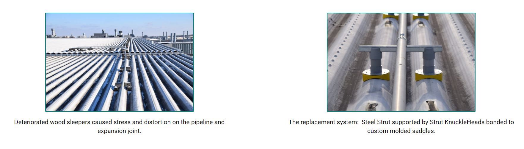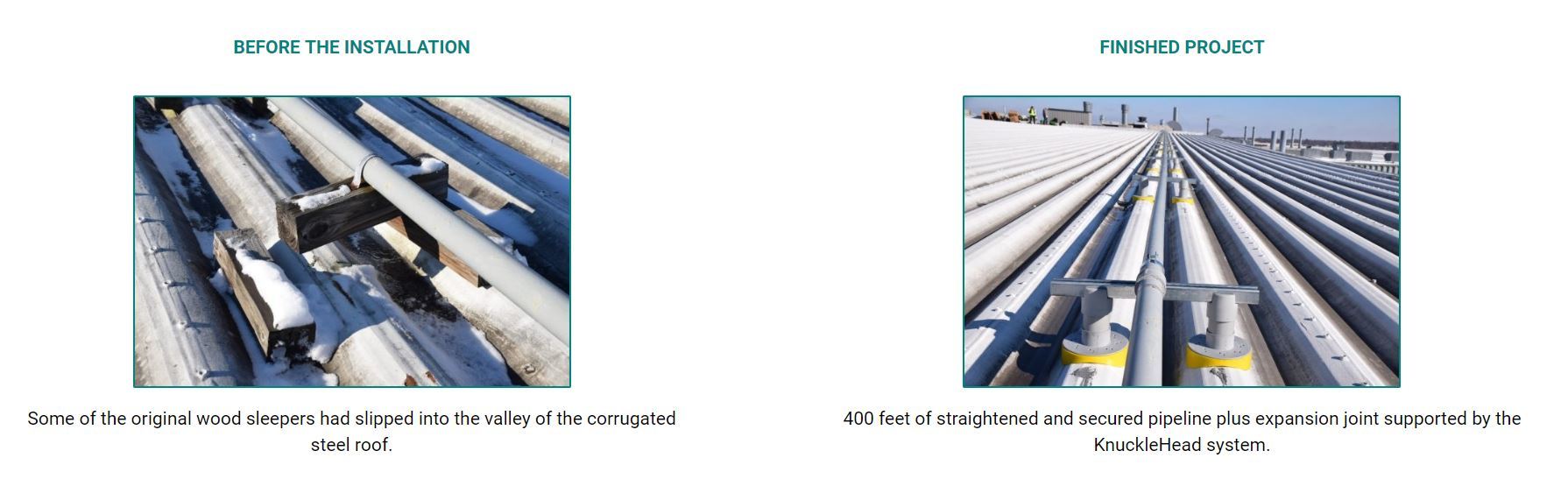 Two installers worked in tandem moving down the pipeline, one removing the wood supports with the other following behind to install the GREEN LINK KnuckleHead system, straightening the pipe and expansion joint along the way. The GREEN LINK system consisted of parallel pairs of Strut KnuckleHeads into which steel channel was positioned to support the pipeline. The KnuckleHeads included extensions to ensure that the pipeline would consistently remain 7 ½ inches off the roof ridge. GREEN LINK Adhesive/Sealant was used to bond the channel into the strut head. The pipe was then clamped into position.