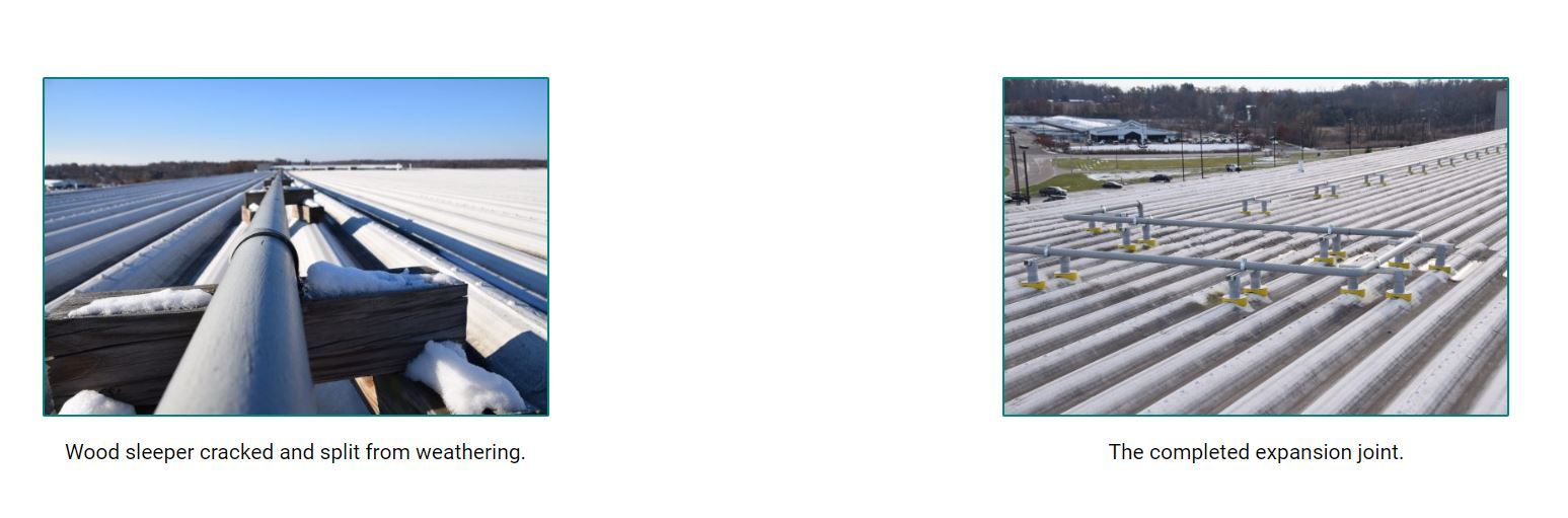 This phase II project required replacing aging wood sleepers supporting 400 feet of a roof-mounted gas line. The roof was built with an upper and lower section each about 200 square feet with a 2 ½ foot drop off. The gas line consisted of 21 sections with an expansion joint about halfway down the length.