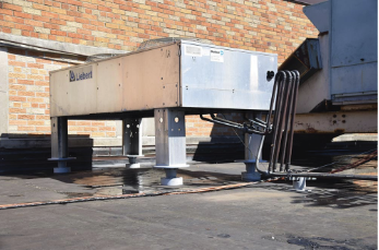 In places, the chiller feet were cantilevered on the steel curbs. EPDM membrane was used to replace the original coal tar roof. The chillers and piping were gently lifted during tear-off and membrane installation, then reset using two types of GREEN LINK KnuckleHeads.