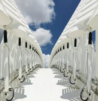 Construction of the building took 28 months and was completed in 2014 with Skanska USA as the lead contractor. The 162,000-square-foot, white-domed building is a moveable and functional work of art and serves as the university’s main classroom and laboratory building. The building includes a system of 94 louvered arms that raise and lower throughout the day providing passive lighting inside the second-floor atrium. The louvers track the sun above a glass roof. The oval-shaped building is ringed by curved metal pergolas that shade its outer terrace and walkways.