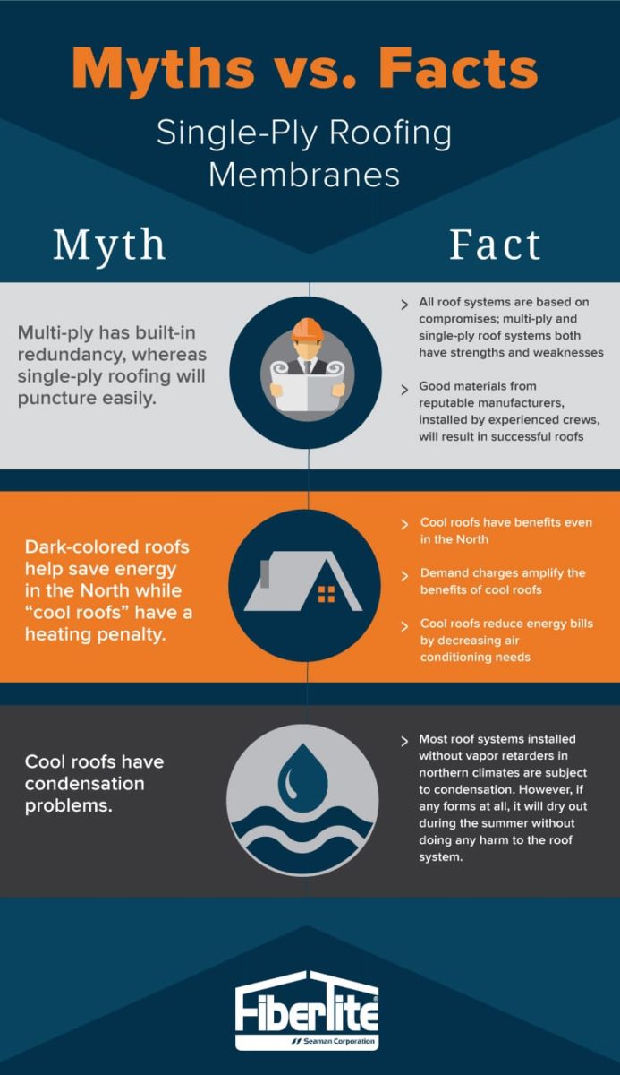 When identifying today’s most prevalent single-ply membrane roof systems and their appropriate application methodologies, there are a number of myths surrounding durability, energy saving capabilities and condensation concerns. Take a look at the myths below to see what’s real when it comes to single-ply roofing.