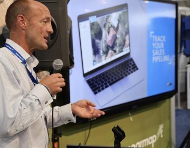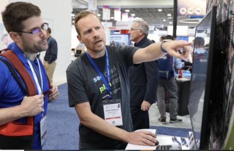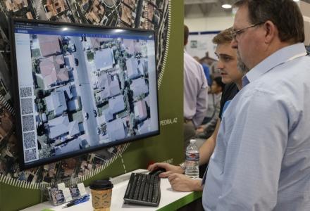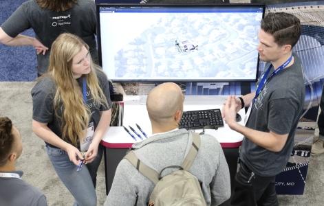 Andrew Birch (top), co-founder of OpenSolar, speaks to attendees in the Nearmap booth; Haley Carling and Blake Stephenson (bottom) share insights in the tool with attendees